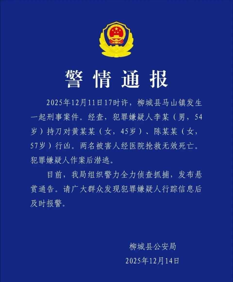 12月14日,广西柳州柳城县公安局发布通报:2025年12月11日17时00分左右,柳城县马山镇发生一起刑事案件。经侦查,犯罪嫌疑人李某(男,54岁)持刀袭击黄某(女,45岁)、陈某(女,57岁)。两名受害人经医院抢救无效死亡,但犯罪嫌疑人作案后潜逃。目前,我局已组织警力全力侦查抓捕,并已下达悬赏通知书。请广大群众发现犯罪嫌疑人行踪后立即报警。据新京报报道,12月13日,记者从广西柳城县马山镇派出所获悉,杀人嫌疑人目前仍被抓获。当地警方已发出悬赏通知,凡提供有助于抓捕犯罪嫌疑人的线索,悬赏10万元。鲁通报显示,犯罪嫌疑人李某,男性,身穿黑色衬衫,驾驶两轮电动车逃跑。来源 |新京报柳城县公安局