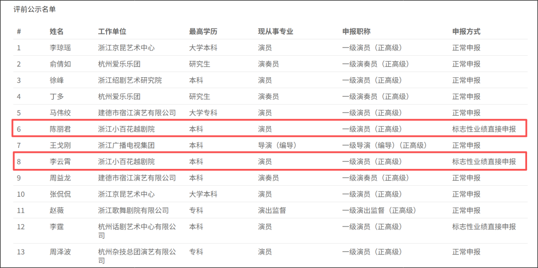 12月1日,浙江省人力资源和社会保障厅网站发布了《2025年浙江省文化广电和旅游厅艺术系列高级(艺术一级)专业技术职务资格预审公告》。其中,浙江小百花越剧院演员陈立军、李云霄在其标志性演出中直接申请一级演员(高级)。越剧演员陈丽君(左)、李云霄表演新改编的越剧《新龙门客栈》。来源:新华社 据报道,陈丽君1992年出生于“越剧之乡”浙江嵊州。 2008年进入越剧小白花班学习,毕业后成为一名越剧演员。 2023年,陈丽君因在《新龙门客栈》中饰演贾婷而名声大噪。他用现代歌剧理念打破了圈子并将传统越剧带到了年轻人的眼前。 2025年,陈丽君凭借《我的大观园》中贾宝玉一角获得第十八届文华表演奖。李云霄,1993年10月出生于浙江省临海市,浙江小百花越剧院(浙江小百花越剧团)演员,鲁派越剧花旦。 2023年,因在新中式越剧《新龙门客栈》中饰演女主角、女老板娘金香玉而走红。 2024年,凭借主演现实主义越剧《钱塘里》获得第32届上海白玉兰戏剧表演艺术奖新主角奖。来源 |浙江省人力资源和社会保障厅政工处