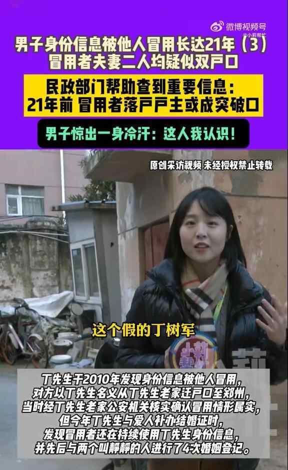 12月25日,河南郑州,丁先生与妻子重新办理结婚证,却意外发现自己和两名名叫晶晶的女子已经登记了四次婚姻。这段时间,男子还利用自己的信息买车买房? “我在2010年就发现它被盗用了,当时公安部门就把它从系统中删除了。我不明白为什么这么多年了我的信息仍然被盗用?”诈骗犯及其妻子均涉嫌拥有双重户口。民政部门帮助寻找重要信息。诈骗犯晶晶登记了四次婚姻。疑似两女在家都有dalpo登记?而假用户涉嫌以投亲名义变更户籍?丁先生出了一身冷汗:转身走的人我认识!来源:小李帮忙